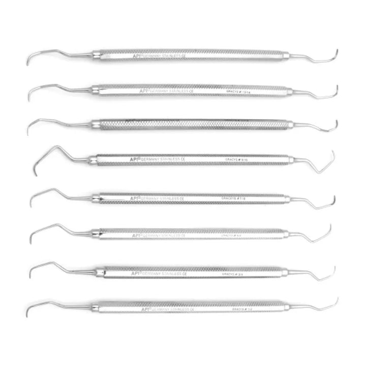 The API Gracey Curettes Set of 8 is a premium collection of periodontal instruments, expertly crafted for precise scaling and root planing. This set includes eight curettes, each uniquely angled to provide optimal access to specific tooth surfaces, including anterior, posterior, mesial, and distal areas. Made from durable stainless steel, these instruments are designed for long-lasting performance, maintaining sharpness and resistance to corrosion. The lightweight, ergonomic handles ensure a comfortable grip, reducing hand fatigue during procedures. Perfect for professional use, this set is ideal for effective plaque and tartar removal in periodontal care.