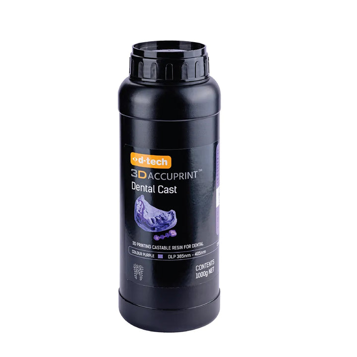 Moreover, the absence of MMA and THF-MA in its formulation underscores its commitment to safety and quality. The 3D Accuprint Dental Cast resin is supplied in a convenient 1000g bottle, providing ample material for multiple applications. In summary, this resin represents a significant advancement in dental casting materials, offering practitioners a reliable and efficient solution for achieving consistently exceptional results. Elevate your dental casting process with the unmatched precision and quality of D-Tech 3D Accuprint Dental Cast 3D Printing Resin.
