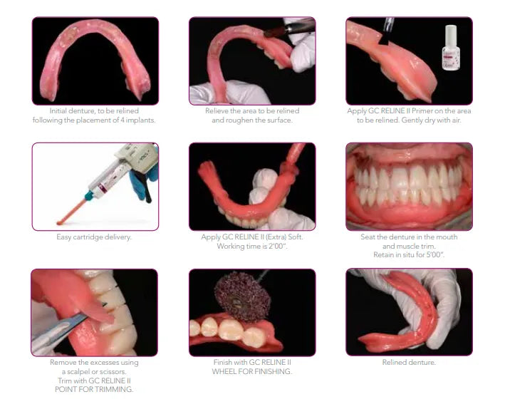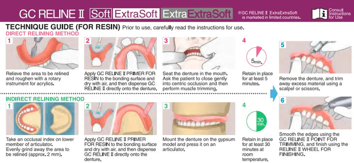 GC RELINE II is a soft denture relining material designed for denture wearers who cannot tolerate conventional hard acrylic denture reliners. Soft denture reliners are typically used for denture patients exhibiting thin, relatively non-resilient mucosa or severe alveolar bone resorption. While soft liners are more comfortable for these patients, they often easily peel from the periphery of the denture and are difficult for the dental professional to grind and adjust.