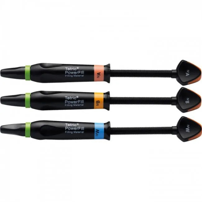 Ivoclar Tetric PowerFill Composite Syringe is a versatile dental composite engineered for the posterior region, offering superior esthetic outcomes. This sculptable 4-mm composite stands out for its ability to create restorations that closely mimic the natural appearance of teeth in the back of the mouth. It is an indispensable choice for dental practitioners seeking true-to-nature results in the challenging posterior region. Notably, Tetric PowerFill features a unique quick-curing capability, with light-curing times starting at just 3 seconds when used with specific curing lights. This efficiency enhances clinical workflow and patient comfort. Its reliability extends to depth of cure, low shrinkage, and optimal flexural strength. The clinical performance aligns with conventional composites, and the low stickiness facilitates precision in crafting anatomical structures. Tetric PowerFill's innovative Ivocerin light initiator and Aessencio Technology ensure a natural esthetic appearance, even in 4-mm increments. It comes in various shades and serves a wide range of indications in posterior dental restorations, making it a valuable asset for dental professionals aiming for both functional and esthetic excellence.