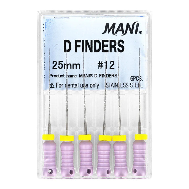 Mani D-Finders 25mm are specialized dental files designed to excel in the intricate realm of endodontics, particularly when confronted with the complexities of calcified or curved root canals. What sets these instruments apart is their distinct D-shaped cross-section, which imparts remarkable strength and resilience. This unique design results in unparalleled blade strength, facilitating smooth and efficient insertion during procedures. One of the standout features of Mani D-Finders is their exceptional ability to penetrate challenging canals. Compared to traditional K-Files, these instruments offer increased resilience, enabling them to effortlessly navigate narrow canals constricted by calcification. Importantly, the cutting flutes of these files are meticulously shaped to prevent a "screwing effect" during use, ensuring precise and controlled movement within the root canal. In essence, Mani D-Finders are the go-to choice for dental professionals seeking precision and effectiveness when dealing with calcified or curved root canals, ultimately leading to successful outcomes in root canal procedures.