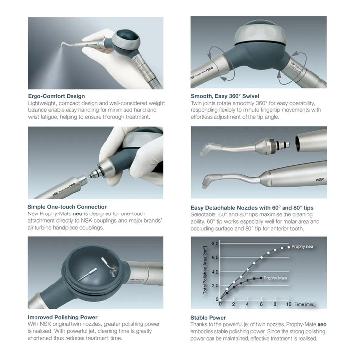 Enhanced Prophy-Mate neo unites form and functionality for easier use. Excellent weight balance and a lightweight, compact powder chamber make Prophy-Mate neo comfortable to hold, while the original NSK handpiece connection swivels 360° even under strong air pressure. Effortless operation shortens the time for the treatment of plaque and stains. 60° and 80°nozzles are available.
