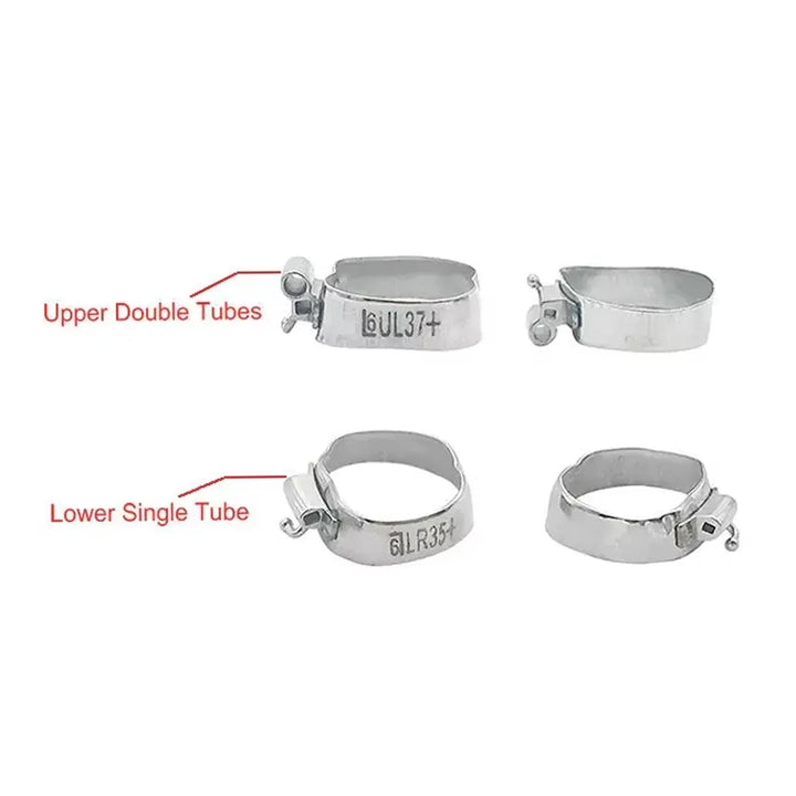 The OSL 1st Molar Prewelded Molar Bands MBT 0.022 U2/L1 are orthodontic bands designed for secure bracket placement on first molars. The U2 (upper) bands feature a dual-buccal tube for archwire engagement and auxiliary attachments, while the L1 (lower) bands include a single tube, both prewelded to anatomically contoured bands for precise fit. Made from medical-grade stainless steel, they ensure durability and patient comfort. The MBT 0.022 slot accommodates standard archwires, and the slim, precontoured design minimizes gingival irritation. Sold in packs of 4, these non-convertible bands are compatible with MBT prescription protocols, ideal for efficient bracket positioning in comprehensive orthodontic treatments.