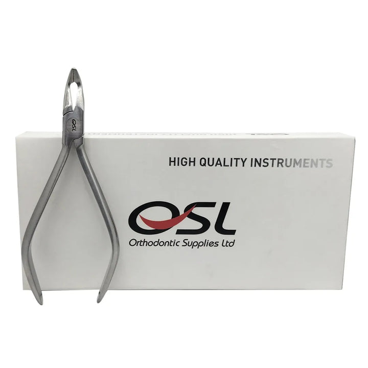The OSL Weingart Plier is a versatile orthodontic instrument with angular, serrated tips designed to firmly hold wires at convenient working angles. It's primarily used to guide and move archwires in and out of placement and for bending archwire ends. Made from high-quality stainless steel, these pliers feature a slim, tapered beak that easily fits between brackets and provides access to difficult-to-reach areas, including lingual and posterior regions. The ergonomic design ensures comfortable handling with reduced finger fatigue. Available in variations including fine-tipped (holding wires up to 0.022"x0.028") and large models (holding wires up to 0.033"), these autoclavable pliers are anti-corrosive and feature a box joint for durability.