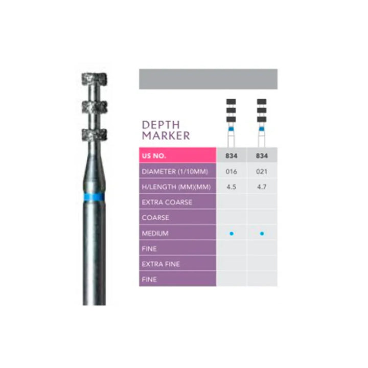 This specialized diamond tool is designed for precise veneer preparations in dental procedures. With three cylindrical features, it allows you to place accurate 0.5mm and 0.3mm deep grooves horizontally across the facial surface of the veneer preparation. The 0.5mm depth is ideal for conservative and accurately prepared veneers, ensuring minimal tooth structure removal while achieving the desired fit. The 0.3mm depth is perfect for ultra-conservative veneers, providing exceptional accuracy for minimal intervention. This diamond tool is a favorite in dental laboratories for its ability to create clean, precise grooves, allowing technicians to work with confidence while ensuring the best fit and appearance for veneers.