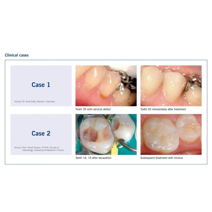This versatile product is suitable for Class III and V restorations, root caries, deciduous tooth restoration, small Class I fillings, temporary fillings, core build-ups, and linings. Its fluoride release capability enhances oral health, and its radiopacity aids in diagnostic clarity. Ionolux is an ideal alternative to the composite bonded to flow (CBF) technique in deep cavities.