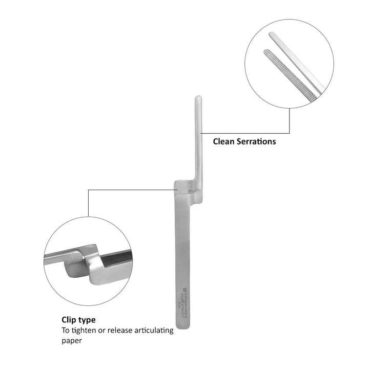 Waldent Wal-Conservatives Articulating Paper Tweezer Miller's Straight 15cm is a precision dental instrument designed for holding articulating paper during occlusion checks. It ensures accurate marking of high spots on dental restorations and natural teeth, allowing better assessment of occlusal contacts. Using the tweezer instead of fingers provides complete and uniform coverage, minimizing contamination and ensuring clear results. Made from high-quality stainless steel, it is autoclavable, durable, and corrosion-resistant, ensuring long-term usability. The straight design offers a comfortable grip and precise control, enhancing efficiency during restorative and prosthetic procedures. Ideal for use in clinics and dental laboratories, it aids in achieving accurate occlusal adjustment
