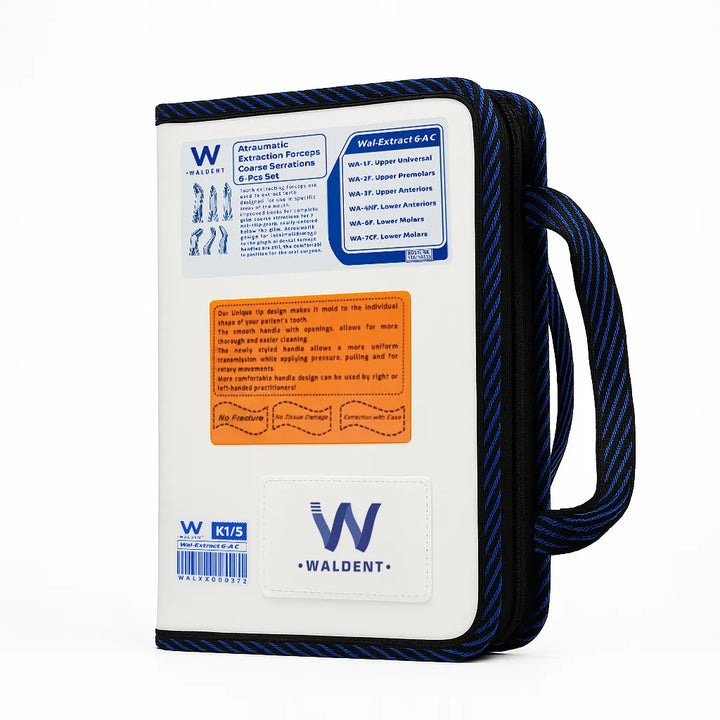 Waldent Atraumatic Extraction Forceps Kit is a perfect need for extractions in minor oral surgery. Most unique feature of Atraumatic Extraction Forceps Kit is the coarse serrations on the forceps beak. Tooth Extracting forceps are used to extract teeth designed for use in specific areas of the mouth. The beak is shaped to conform snugly to the contour of the tooth. This makes it easier to reach different teeth effectively. Dental forceps handles are shaped so that a maximum amount of force can be applied to the beaks, while the handles are still in a comfortable position for the oral surgeon.