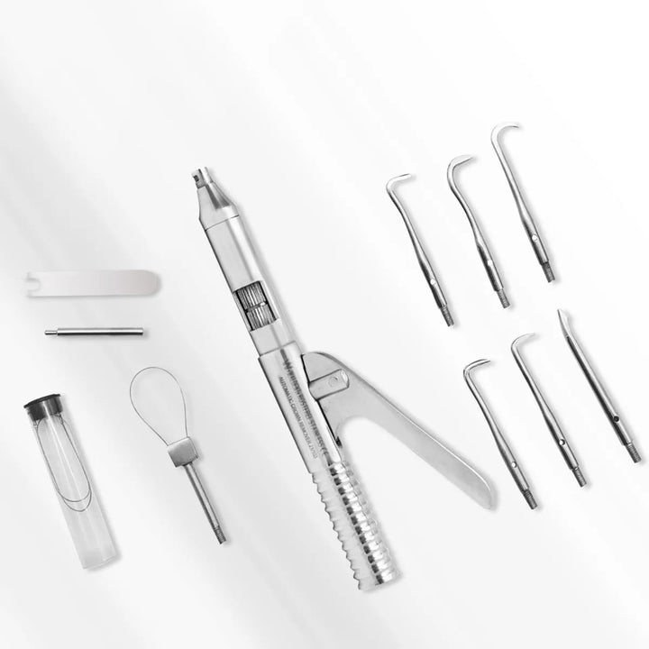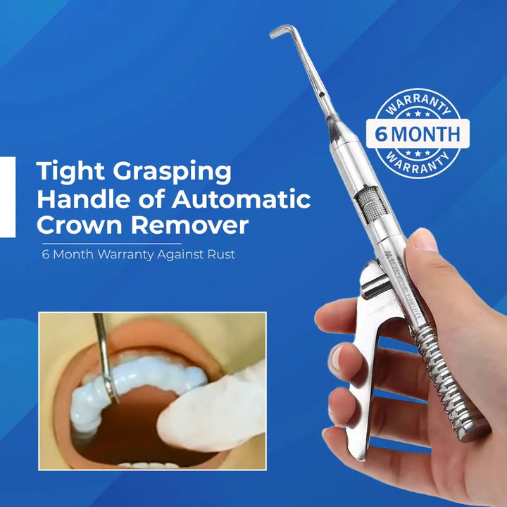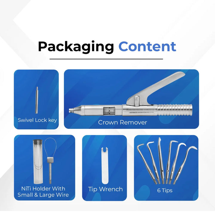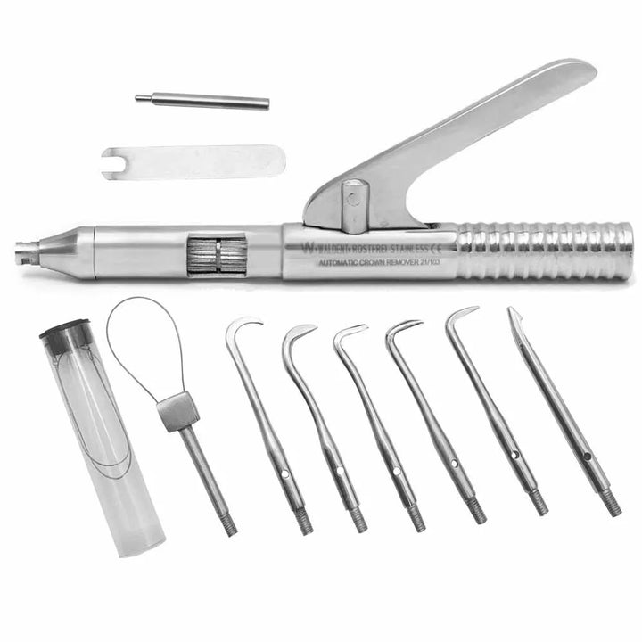 Waldent Automatic Crown Remover Kit is a spring-loaded mechanical device to remove the bonded crowns and bridges by an intensive impulse.Spring loaded crown remover with 6 tips, a wrench and a swivel lock key.Special tip for bridge removing and impulse strength is controllable.Six different designs of tips allow engaging in different places of crown margins.It has a special steel string that can be pulled underneath the bridge and engaged in the rectangular tip when an impulse is applied to it pulls out the bridge.Impulse strength should be lowered for root treated teeth.For permanent removal of crowns by breaking the seal between tooth and crown even after sectioning with a bur.The setting of the impulse to a higher level can break the underlying tooth. Be careful.