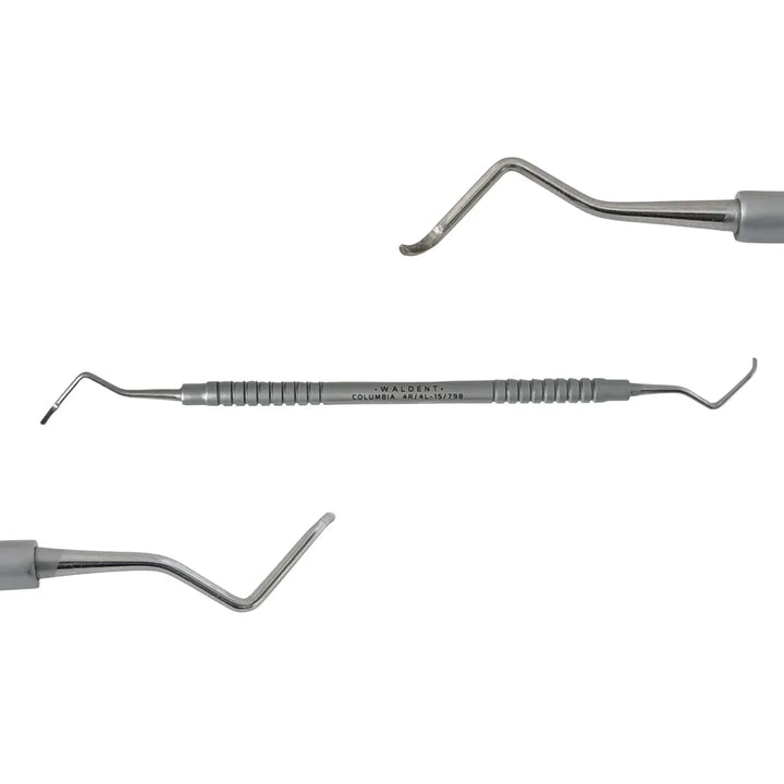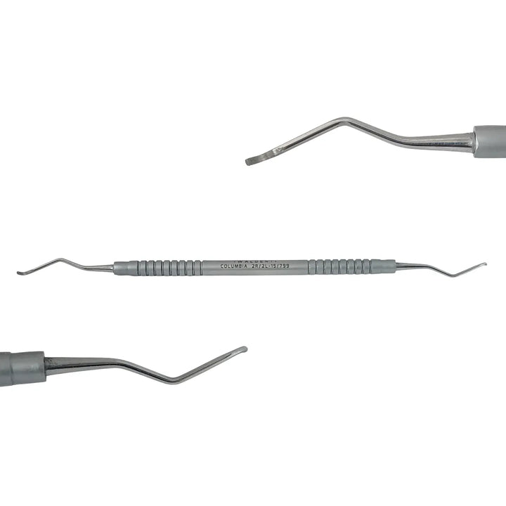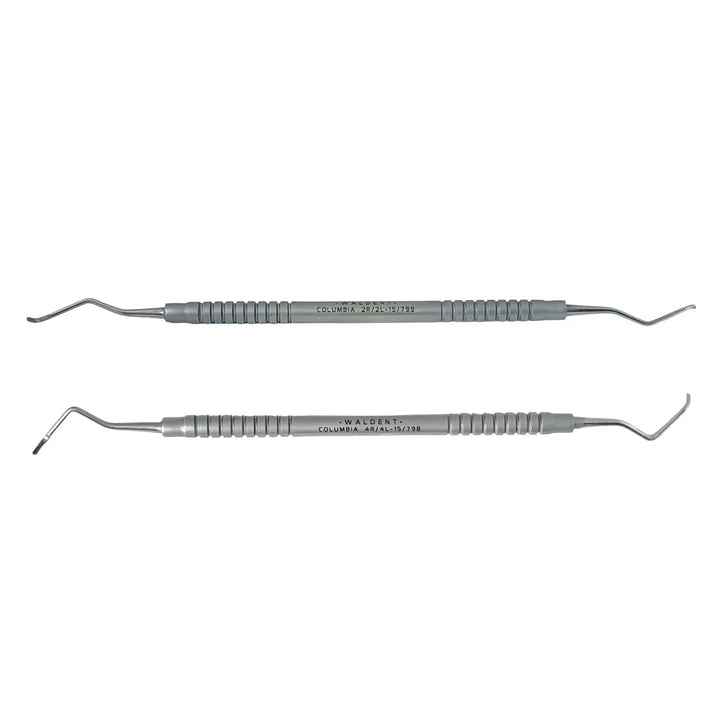 Waldent columbia curettes, available in both 2R/2L and 4R/4L designs, are precision instruments used for periodontal scaling and root planing, particularly in the anterior region of the mouth. These curettes are expertly crafted to remove moderate to heavy calculus from all supra and subgingival tooth surfaces, making them ideal for the treatment of both the anterior and posterior teeth, including canines. The small contra-angle and return angle of the Columbia Curettes 2R/2L provide excellent access and stability, especially when working in the lower anterior region with the patient in a supine position. The long shank design of the 2R/2L curette enhances maneuverability and control, ensuring effective scaling and root planing. The 4R/4L version offers similar precision for a wider range of applications. These high-quality instruments are designed for optimal performance in periodontal procedures, ensuring both comfort and efficiency during treatments.
