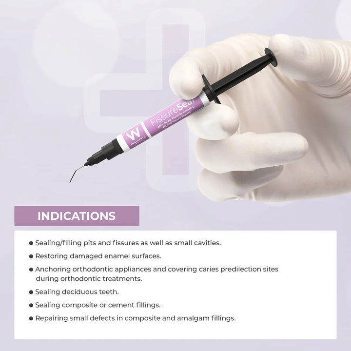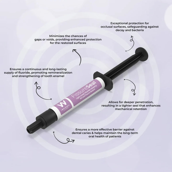 Waldent FissureSeal is a light-curing, fluoride-releasing dental sealant designed to provide exceptional protection for occlusal surfaces. Its optimal flow characteristics enable deeper penetration, resulting in a tighter seal that enhances mechanical retention. The unique resin system of FissureSeal reduces shrinkage, ensuring a tighter seal that offers superior protection against decay and bacteria. FissureSeal's inorganic filler component is specially designed to maximize fluoride release, offering long-term benefits for patients