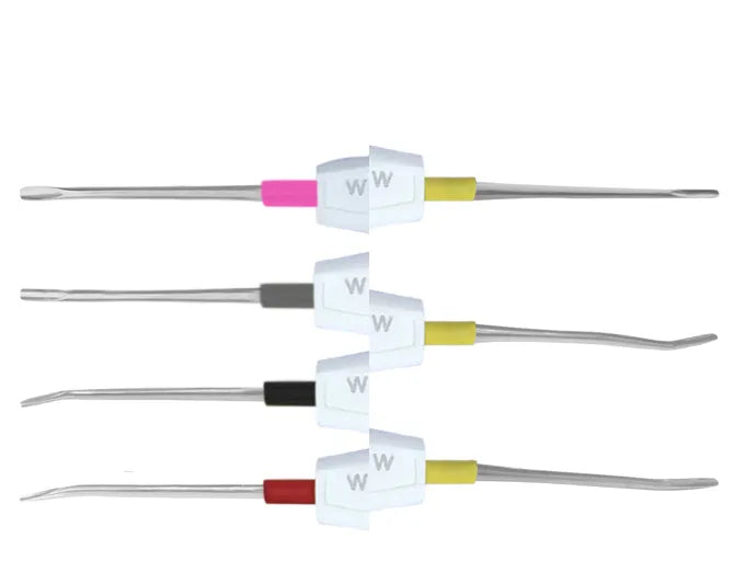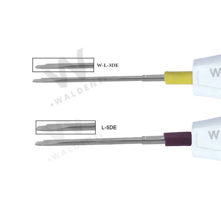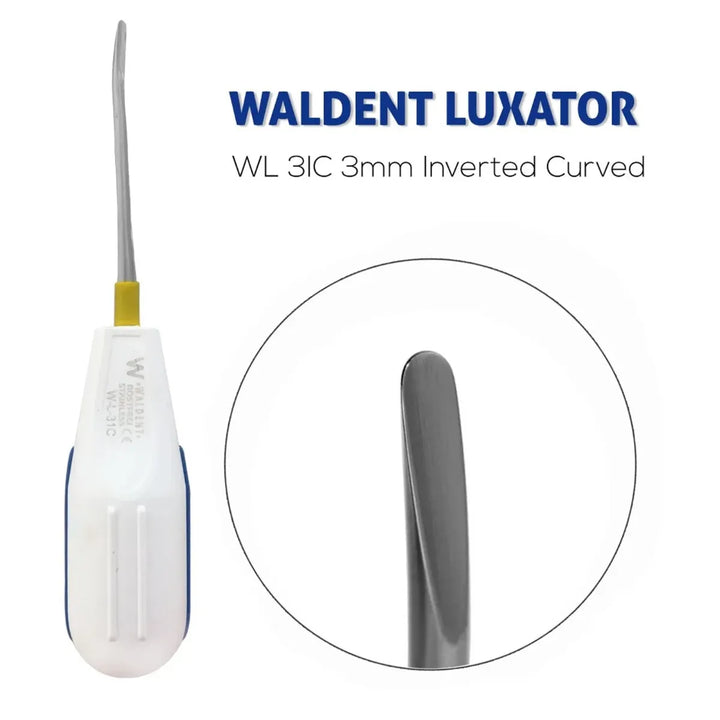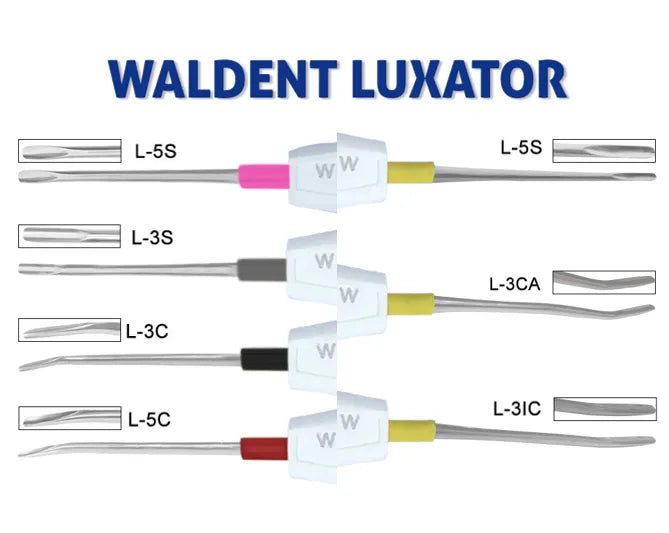 Waldent Luxators incorporate the world acclaimed ergonomic handle and a unique cornered, rigid tip that enables elevation of roots without risk of damaging the adjacent tooth.
