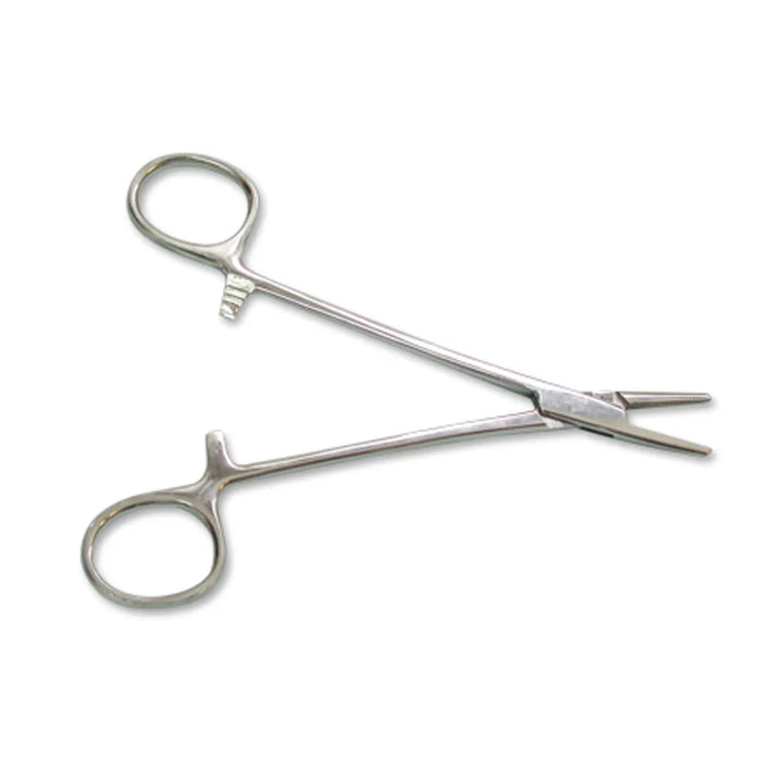 Key components include jaws, joint, and handles, with a clamp mechanism to lock the needle securely. Its durable design ensures reliability in multiple surgical applications. The instrument appears similar to a hemostat, available in various lengths and tip shapes for versatile use in dentistry and beyond.