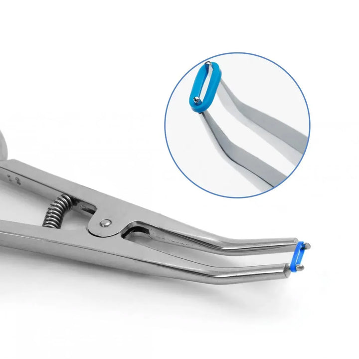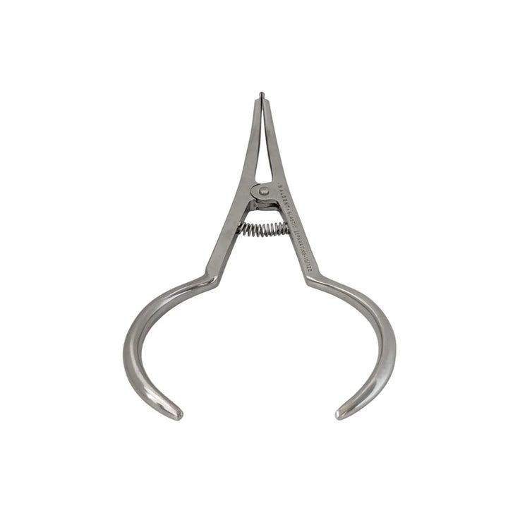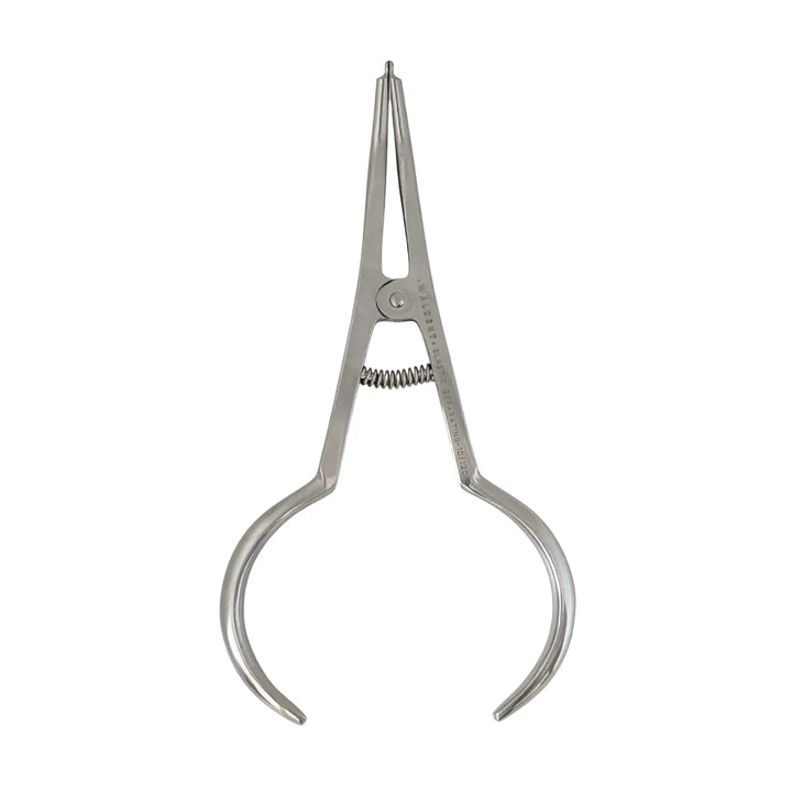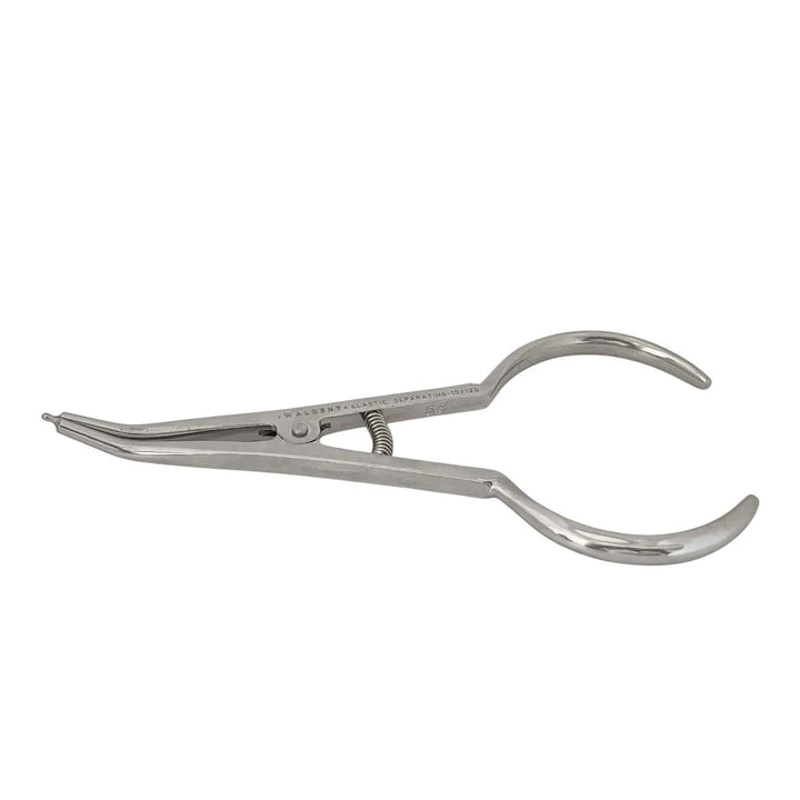 Separating orthodontic pliers are designed to spread and hold elastics during placement. These pliers feature a long barrel-shaped, tapered tip for prime accessibility and placement in any quadrant. The beaks may be angled, and the tip is grooved to prevent slippage until elastic is ready to be placed. The width of the opening is often controlled via a screw.