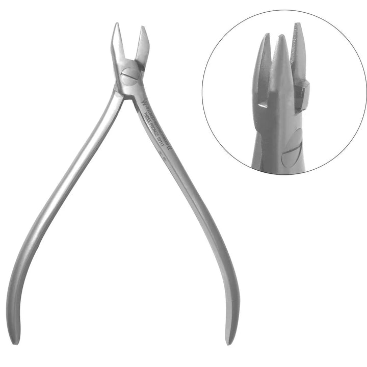 Three-prong orthodontic pliers are useful for grasping wires and clasps for intraoral archwire adjustments as well as for lingual arch adjustments. It can have a wide range of beak characteristics, and maybe long and tapered for hard-to-reach quadrants or short and stubby for firmer control. The double tip should feature one-piece construction to eliminate flaring, and beaks may feature tungsten carbide inserts for superior grip, longevity, and prevention of wire scoring. Three-pronged pliers most often have a box-style joint for durability and accurate force. They are constructed from surgical grade stainless steel for corrosion resistance and strength, and to be fully autoclavable. Precision tips for accurate wire and clasp adjusting and contouring useful for bending orthopedic appliances.