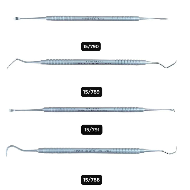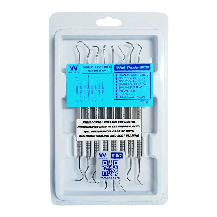 Waldent Perio Scalers Set of 8 is an essential toolkit designed for professional periodontal care. This set features eight high-quality, precision-crafted scalers, each with a round solid handle for enhanced grip and comfort during extended procedures. The set is ideal for both general and specialized periodontal treatments, offering a range of scalers designed to effectively remove plaque, calculus, and debris from various tooth surfaces, ensuring optimal gum health and cleanliness.