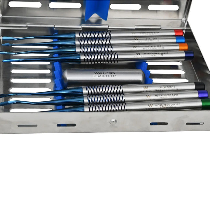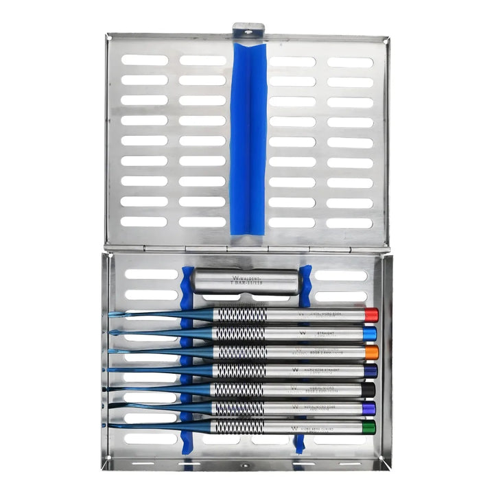 Discover the Waldent Premium Luxating Elevators Set, a comprehensive kit of 8 precision-crafted instruments designed to elevate and extract teeth with utmost precision and minimal trauma. Each elevator features a specific tip for accurate and gentle insertion into the periodontal ligament, aiding in efficient gingival retraction during dental procedures.