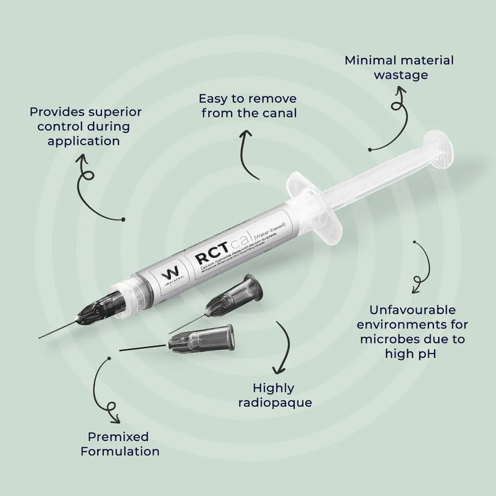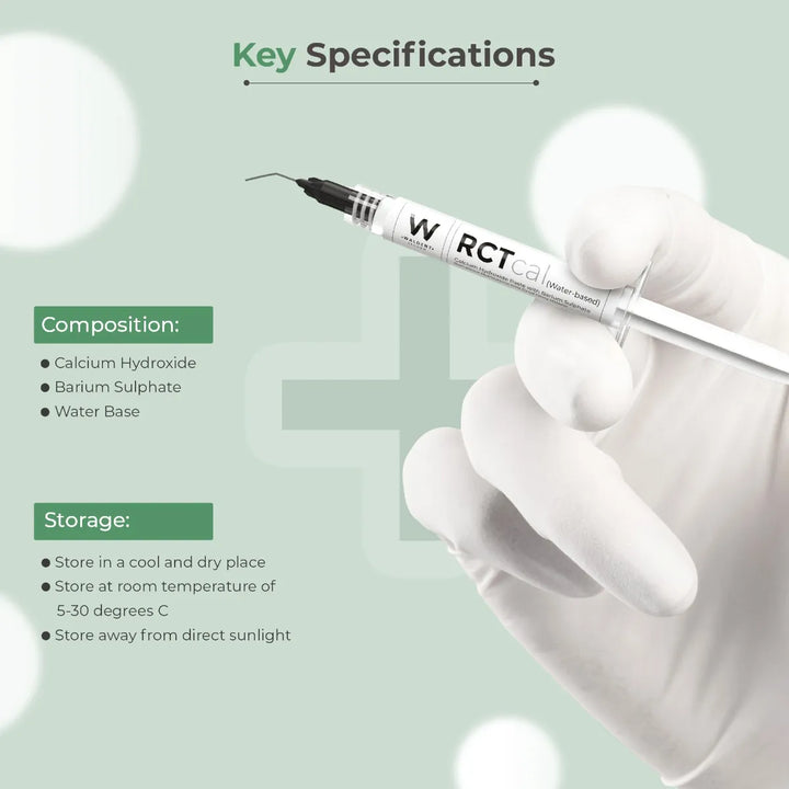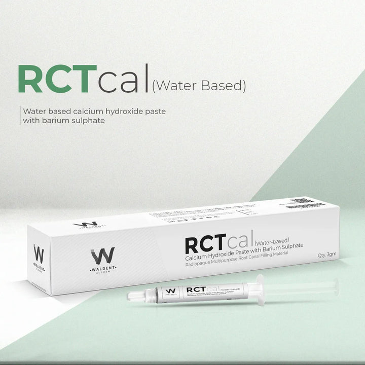 RCTcal is a radiopaque, water-based paste used in endodontic procedures, formulated with calcium hydroxide and barium sulphate. With a basic pH of ≥12.5, this paste is specifically designed for root canal filling.