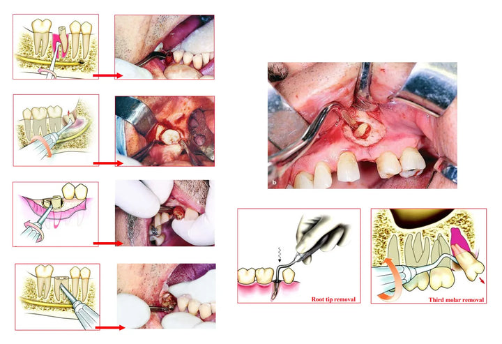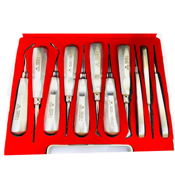 Waldent Root Elevators Premium Set of 11 (K2/2) is meticulously engineered to enable precise and tissue-preserving extractions in implantology. Each instrument within the set features a specialized curvature tailored to address the complexities of apical root anatomy, ensuring optimal extraction outcomes. With sharp working tips, these elevators facilitate smooth engagement with tooth anatomy, minimizing trauma to surrounding tissues and reducing the need for complex bone augmentation procedures. The ergonomic design enhances user comfort and control, reducing fatigue during procedures. Crafted to fit comfortably in the hand, these elevators exemplify precision, reliability, and excellence in dental instrumentation, advancing the field of implantology.