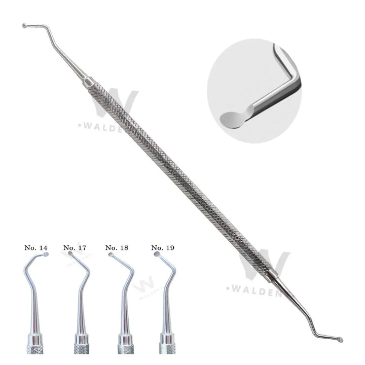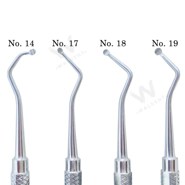 Featuring a range of sizes and shapes, including No. 14 (1.5 mm diameter), No. 17 (1.2 mm diameter), No. 18 (1.5 mm diameter), and No. 19 (2.0 mm diameter), Waldent Spoon Excavators cater to diverse clinical needs across different tooth surfaces and oral cavity regions.