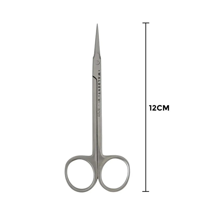 Waldent Surgical Micro Iris Straight (3/123) is precision-engineered with an extra slim, sharp working end, ideal for cutting the finest tissues and sutures in oral and maxillofacial surgeries. Featuring an extremely fine, sharp tip, it allows for detailed dissection and delicate suture removal with excellent control. Crafted from high-grade stainless steel, it offers durability, corrosion resistance, and rust-free performance. The ergonomic finger-ring design ensures a comfortable grip and reduces hand fatigue during prolonged procedures. Measuring approximately eleven and a half centimeters in length, this lightweight instrument is autoclavable at high temperatures for safe sterilization. Its straight shape enhances maneuverability and precision, making it an essential tool for dental surgeons requiring accuracy and efficiency in delicate surgical tasks.