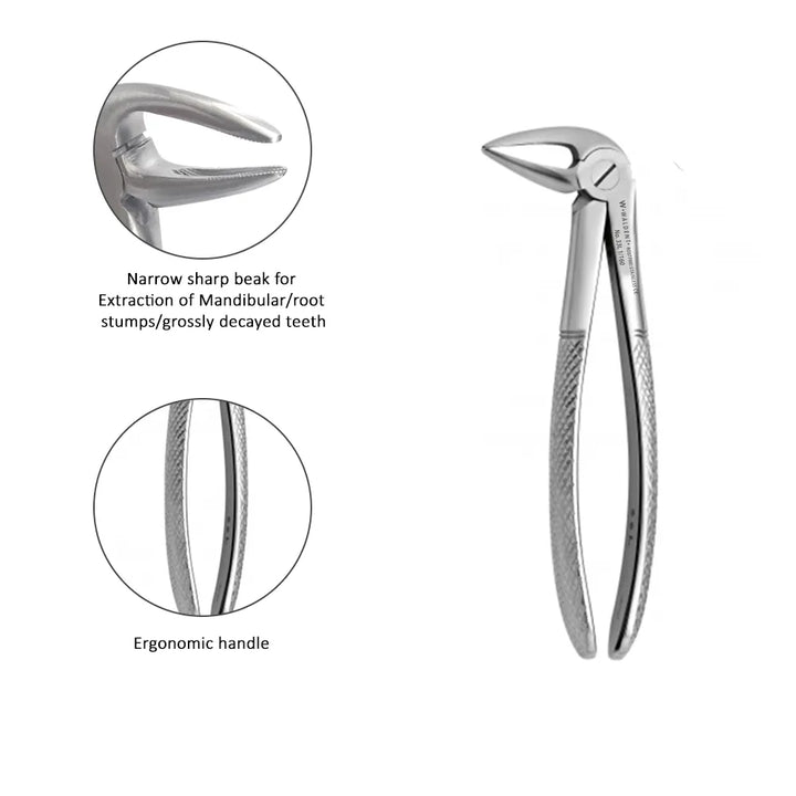Waldent Extraction Forceps is a perfect need for extractions in minor oral surgery. Tooth Extracting forceps are used to extract teeth designed for use in specific areas of the mouth. The beak is shaped to confirm snugly to the contour of the tooth. Dental forceps handles are shaped so that a maximum amount of force can be applied to the beaks, while the handles are still in a comfortable position for the oral surgeon.
