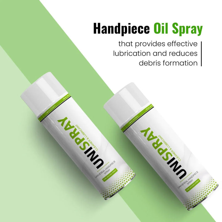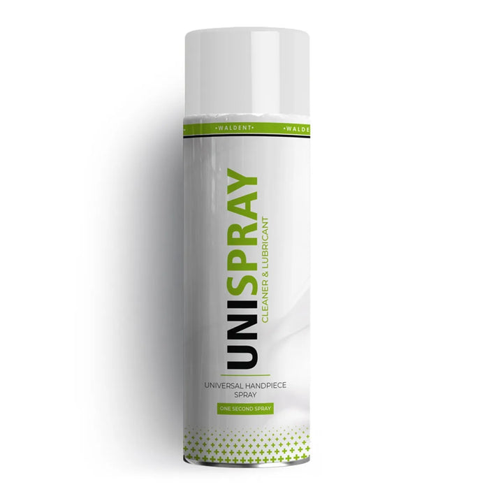 The Waldent Unispray Universal Handpiece Spray is an eco-friendly solution for maintaining your dental instruments. Designed to protect and care for your valuable handpieces, this spray ensures precise lubrication and cleaning exactly where it's needed, all without the use of harmful CFCs (chlorofluorocarbons).
