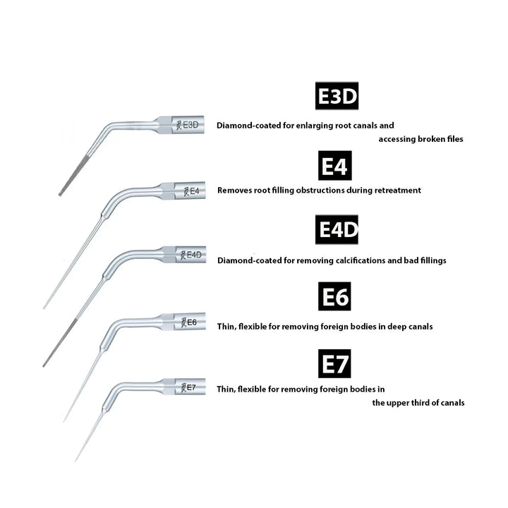 - E4D: Diamond-coated (40μm) for removing calcifications and bad filling material in root canals during retreatment; diamond coating is 15mm long.