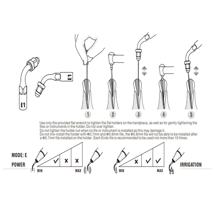 - E1: 120° holder for ultrasonic files 0.7mm or 0.8mm files; best for cleaning and irrigating root canals, particularly in anterior teeth.