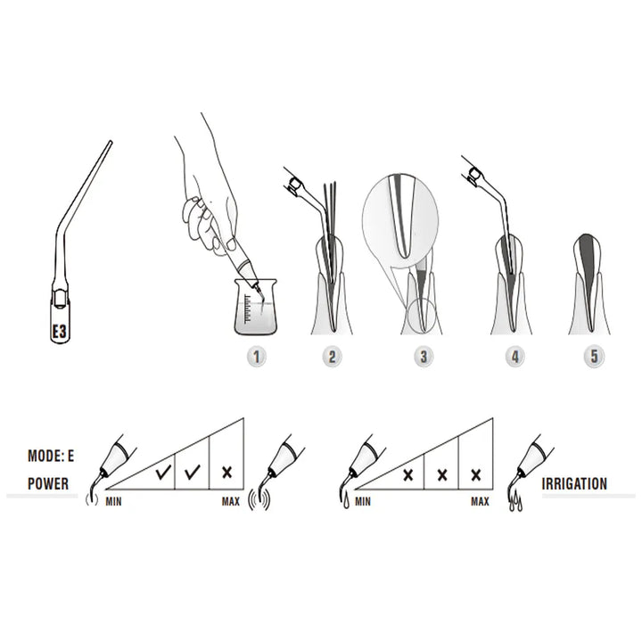 - E3: Used for melting gutta-percha in root canals; immerse in eugenol before use, press gently, and activate to condense the gutta-percha.