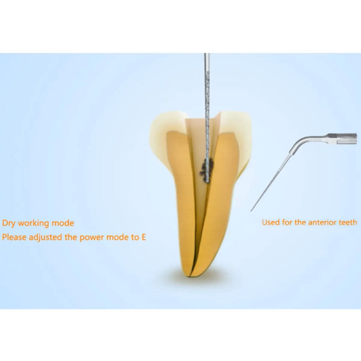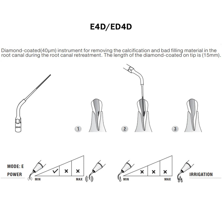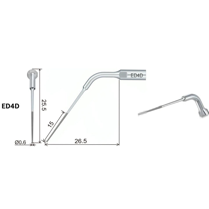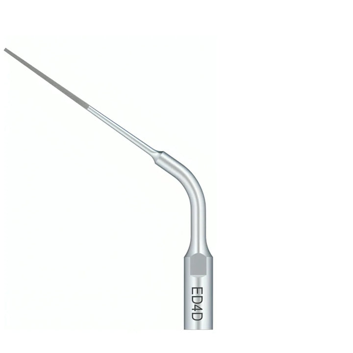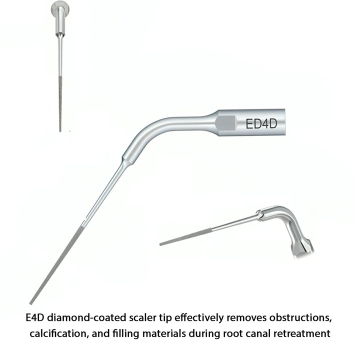 Woodpecker Scaler Tip ED4D for DTE & Satelec Scalers is a specialized tool designed for root canal retreatment, specifically for removing obstructions within the root. This tip features a diamond coating that enhances its ability to effectively eliminate calcification and filling materials during root canal procedures. With a length of 15mm, the ED4D tip is optimized for accessing and clearing materials from the upper half of the root canal. Its stainless steel construction ensures durability and reliability in clinical settings. The ED4D scaler tip is compatible with DTE & Satelec ultrasonic scalers, making it a versatile addition to any dental practice focused on endodontic treatments. This tool is essential